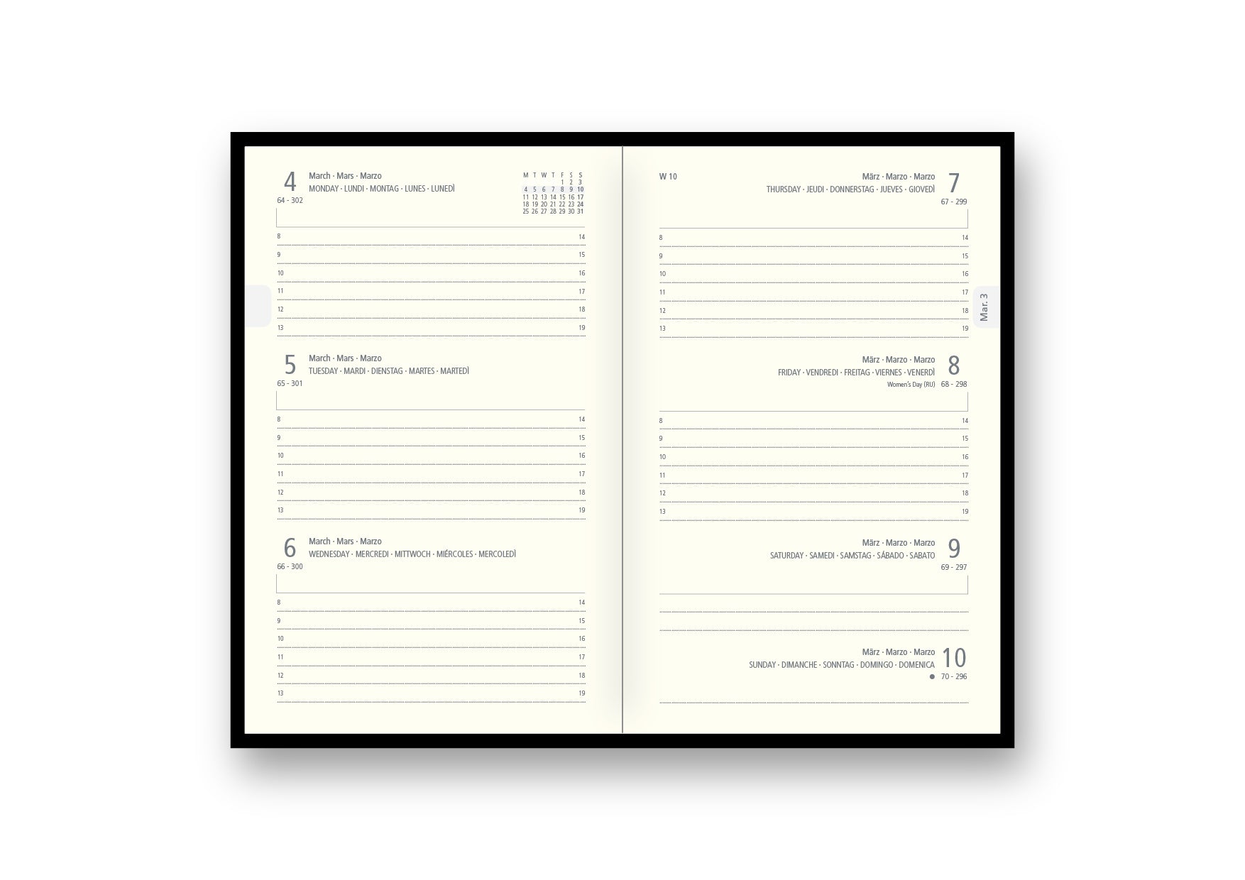 Agenda settimanale a blocco fisso con elastico, carta avorio, tasca portabiglietti a fine libro, copertina in sintetico rugato a trama saffiano. Penna in dotazione